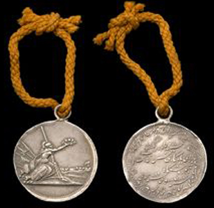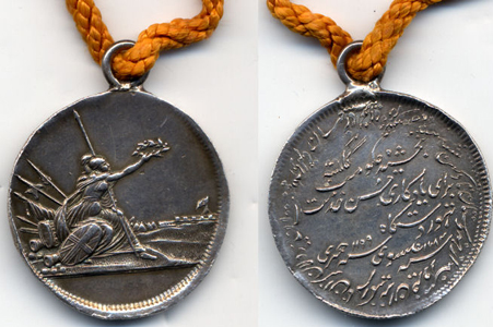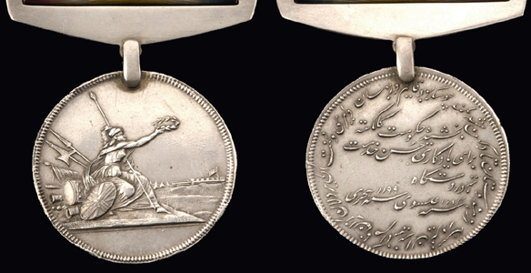 The Second Anglo–Mysore War was a conflict between the Kingdom of Mysore and the British East India Company from 1780 to 1784. At the time, Mysore was a key French ally in India, and the conflict pitting Britain against the French and Dutch in the American Revolutionary War sparked Anglo–Mysorean hostilities in India. The Deccan medal, issued in either gold or silver, was issued by the East India Company to Indian officers who fought in Gujarat for the First Maratha War of 1778-1782 and in the Carnatic during the Second Mysore War of 1780-1784. The obverse of the Deccan medal features the figure of Britannia seated on a military trophy, holding a laurel wreath in her right hand out towards a fort where the British flag is flying. A Persian inscription that reads: PRESENTED BY THE CALCUTTA GOVERNMENT IN MEMORY OF GOOD SERVICE AND INTREPID VALOR, AD 1784, AH 1199 is in the center of the reverse. Around the circumference of the medal's reverse is written: LIKE THIS COIN MAY IT ENDURE IN THE WORLD, AND THE EXERTIONS OF THOSE LION-HEARTED ENGLISHMEN OF GREAT NAME, VICTORIOUS FROM HINDOSTAN TO THE DECCAN, BECOME EXALTED. ![]() Large Deccan Medal Fitted with Straight Suspender ![]() Large Deccan Medal on Cord It was awarded in 43mm gold to Subadars (native officer ranking below British commissioned officers and above non-commissioned officers), 43mm silver-gilt to Jemadars (lowest rank of commissioned officers) and other native officers, and 32mm silver to native non-commissioned officers and soldiers. ![]() Small Deccan Medal on Cord
