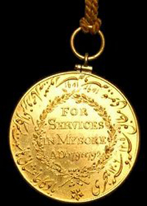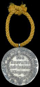 ![]() Gold Mysore Campaign Medal The obverse of the 1.5-inch, circular Mysore medal features a Sepoy (lowest rank of infantryman) with his foot resting on a dismounted cannon, holding the British Colors in his right hand and the Mysore Flag in his left, with a fortified town in the background. The reverse is inscribed, FOR SERVICES IN MYSORE AD 1791-1792 on four lines within a wreath, with a Persian inscription outside the wreath which reads: A MEMORIAL OF DEVOTED SERVICES TO THE ENGLISH GOVERNMENT AT THE WAR OF MYSORE. CHRISTIAN ERA, 1791-1792, EQUIVALENT TO THE MAHOMEDAN ERA, 1205-1206. Poor quality fakes exist.