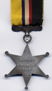 ![]() The Kimberley Star Kimberley Medal The mayor and council of Kimberley created the Kimberley Medal. It was struck in England but, due to the fact that it incorporated an unsanctioned Royal Cipher on the reverse, most of the medals were melted down. No medals were issued and it is unclear how many medals survived. The obverse shows a figure of Victory above the Kimberley Town Hall, the dates 1899-1900 and the words SOUTH AFRICA. The reverse has the inscription in two shields INVESTED 15 OCT 1899 and RELIEVED 15 FEB 1900. There is an Imperial Crown, Royal Cipher and the words TO THE GALLANT DEFENDERS OF KIMBERLEY. ![]() The Kimberley Medal Cape Copper Company Medal for the Defense of O'okiep The Cape Copper Company had its origin in the Cape Copper Mining Company that was established in 1862 or 1863 as the Cape of Good Hope Copper Mining Company to take over the copper mining properties of Phillips & King, an enterprise that had been involved in copper mining around O'okiep in Namaqualand since the 1850s. The Cape Copper Mining Company was restructured as the Cape Copper Company in 1888. The O'okiep Garrison, commanded by Lieutenant Colonel W.A.D. Shelton DSO, consisted of some 900 men and included local miners who assisted Shelton’s troops. The civilian defenders were mostly employees of the Cape Copper Company and many were natives. After the war ended, the British government awarded the Queen's South Africa Medal to all those regular troops that had seen active service in Namaqualand during the war. When it became known that the native members of the O'okiep Garrison were excluded from receiving the QSA medal, the Cape Copper Company decided to strike a medal of its own and to present it to the defenders of the town, regardless of race. Two versions of the unofficial Cape Copper Company Medal for the Defense of O'okiep were awarded by the Cape Copper Company Limited to members of the O'okiep Garrison, who defended the town while it was besieged by Boer Commandos from April 4 to May 4, 1902. The bulk of the private campaign medals were struck in bronze (537) and were awarded to the rank and file of the military and civilian defenders of the town, most of whom were mine workers who had taken part in the defense of O'okiep. Eighteen silver medals were awarded to officers, higher ranking mine officials and at least one non-commissioned officer, Paymaster Sergeant Harry Rodda, who was also the paymaster of the O’okiep Copper Company. The Cape Copper Company Medal measures 36.5mm in diameter with a raised rim. The obverse depicts the encircled company emblem, a miner with a spade standing next to a mining cocopan (a small wagon running on a narrow gauge railway line), and inscribed 1888 at the bottom and THE CAPE COPPER COMPANY LIMITED around the perimeter. The reverse is smooth with a raised rim and is inscribed PRESENTED TO THE OFFICERS NON-COMMISSIONED OFFICERS AND MEN OF THE GARRISON OF OOKIEP IN RECOGNITION OF THEIR GALLANT DEFENCE OF THE TOWN UNDER LT. COL. SHELTON. D.S.O. AGAINST A GREATLY SUPERIOR FORCE OF BOERS APRIL 4TH TO MAY 4TH 1902.