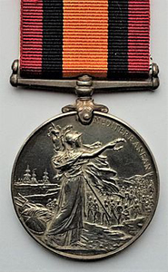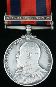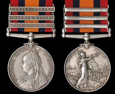 Queen's South Africa Medal (QSA) The 38mm, silver Queen's South Africa Medal was awarded to all British forces who served in South Africa from October 11, 1899 up to the end of the war on May 31, 1902. Units from the British Army, Royal Navy, Colonial Forces from Australia, Canada, New Zealand, India, the Cape of Good Hope, the Colony of Natal and "Hensoppers" (joiners and collaborators, literally hands-uppers or volunteers) from the South African Republic and Orange Free State, civilians employed in official capacity, war correspondents, and non-enlisted men of whatever nationality who drew military pay, qualified for the award of the medal. Approximately 178,000 were awarded. This included those such as the New Zealand 10th Contingent, who arrived in Durban in May 1902, but did not fight. Bronze versions were awarded to some Indian troops and non-enlisted men of whatever nationality, who drew military pay. The obverse depicts a crowned and veiled effigy of Queen Victoria, facing left, with the inscription, VICTORIA REGINA ET IMPERATRIX around the upper portion. The reverse shows Britannia holding the Union Flag in her left hand and a laurel wreath in her right hand. In the right background are troops marching inland from the coast. In the left background are two men-of-war, with Neptune's Trident and Britannia's shield on the ground in the foreground. Around the upper portion is the inscription, words SOUTH AFRICA. Three versions of the medal's reverse are known to exist. Since the war was initially expected to be of short duration and to reach its conclusion in 1900, the first medals (Type 1) were struck with the years 1899 and 1900 in the right upper quadrant of the reverse and with Britannia's wreath pointing towards the R in AFRICA. Approximately fifty of the Type 1 medals were awarded to Lord Strathcona's Horse (Royal Canadians) before it became evident that the war was going to drag on much longer. The rest of the dated medals (Type 2), which had already been minted, had the dates machined off (some still visible) and are known as Ghost Medals. The Type 2 reverse is otherwise identical to Type 1. The third version (Type 3) was minted with new dies without the years and with Britannia's wreath now almost touching the F of AFRICA. ![]() Queen's South Africa Medal Obverse & Reverse Type 3