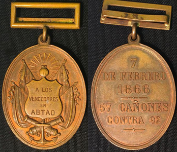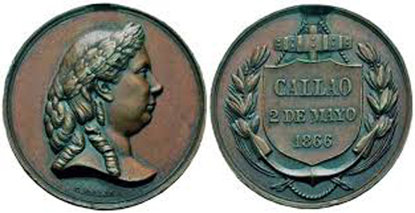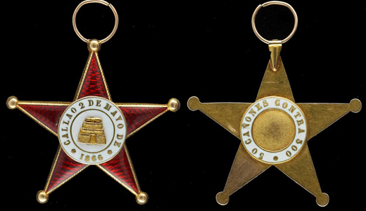 CHINCHA ISLANDS WAR 1864-1866 The CHINCHA ISLANDS WAR, also known as Spanish–South American War was a series of coastal and naval battles between Spain and its former colonies of Peru and Chile from 1864 to 1866. The conflict began with Spain's seizure of the guano-rich Chincha Islands in one of a series of attempts by Spain, under Isabella II, to reassert its influence over its former South American colonies. The war saw the deployment of ironclads, including the Spanish ship, Numancia, the first ironclad to circumnavigate the world. On April 14, 1864, in retaliation for Peru's refusal to pay an indemnity, the Spanish fleet seized the lightly defended Chincha Islands. The islands were the principal source for Peruvian guano, an important agricultural resource. The Spanish placed the Peruvian governor of the Islands, Ramon Valle Riestraunder, under arrest aboard the Resolucion, occupied the islands with 400 marines and raised the Spanish flag. Spain considered these islands an important bargaining tool, as they were a major Peruvian economic asset and produced almost 60% of the government's annual revenue. The Spanish squadron also blockaded principal Peruvian ports, disrupting commerce and fostering a high level of resentment throughout Latin America. Spain expected little resistance from Peru, believing its military capabilities to be negligible. Even before Chile and Peru were formally allied, Spain had suffered a humiliating naval defeat at the Battle of Papudo on November 26, 1865. During this engagement, the Chilean corvette Esmeralda captured the Spanish schooner Covadonga, taking the crew prisoner and seizing the Admiral's war correspondence. This humiliation was too much for Admiral Pareja, and he committed suicide two days later aboard his flagship. Following the Admiral's death, the general command of the Spanish fleet in the Pacific was assumed by Commodore Casto Mendez Nunez, who quickly received a promotion to rear admiral. Chile and Peru formally signed an alliance against Spain on December 5, 1865. The Peruvian Congress ratified this alliance on January 12, and two days later (January 14, 1866), Peru finally declared war on Spain. Chile's navy was weak, almost non-existent. To reinforce its Chilean ally, a Peruvian squadron under the command of Captain Lizardo Montero was immediately dispatched to the south. Among the ships in the squadron were the steam frigates Amazonas and Apurímac. Spain's Admiral Mendez Nunez sent two of his most powerful ships (the frigates Villa de Madrid and Reina Blanca) south to destroy the combined Chilean-Peruvian fleet. The allied squadron had been placed under the command of Peruvian Captain Manuel Villar and had taken refuge at Abtao, a well-protected inlet near the gulf of Chiloe in southern Chile. The Spanish squadron appeared at the entrance of the inlet on February 7, 1866, but the Spanish did not enter as they did not want to risk their ironclads running aground in the shallows. A cannonade lasting several hours was exchanged with little effect. In spite of being at anchor, without steam, and with some ships with their engines undergoing overhaul, the Peruvian-Chile allies mounted an energetic fight. The Covadonga, under the command of Lieutenant Manuel Thomson, managed to fire over an island and scored several hits on the frigate Blanca. The battle ended indecisively without further developments. Reluctant to enter shallow waters and realizing that a long- range gun duel served no purpose but to waste ammunition, the Spanish commanders withdrew. Williams and the Esmeralda were not at the anchorage on the day of the battle. The commodore had sailed to Ancud for coaling. On its way back to Valparaiso, the Spanish squadron captured a Chilean steamboat (the Paquete del Maule) that was transporting sailors to crew the new Peruvian ironclads Huoscar and Independencia. ![]() SPANISH MEDAL for CALLAO 1866 Admiral Mendez Nunez, displeased at having to resort to destroying defenseless targets such as Valparaiso and with the inconclusive result at Abtao, decided to change tactics and attack a heavily defended port. As a result, the Admiral set sail for the Peruvian port city of Callao. The Battle of Callao took place on May 2. After the battle, both sides claimed victory. Peruvian defenders claimed that they had halted the Spanish from regaining their lost authority and prestige in South America, prevented them from enforcing their demands upon Peru and forced the withdrawal of the Spanish fleet (technically correct, since Peruvian cannons fired the last shots in the battle). The Spanish claimed to have visited punishment upon its former colony. Spanish guns had managed to cause only limited damage to defenses, and most of the cannons and artillery as well as buildings within Callao, itself, survived the battle intact. MEDAL for CALLAO 1866 This 30 mm Spanish medal was engraved and signed (on the obverse) by Gregorio Sellan. It features the bust of Queen Isabella II on the obverse and a shield placed on top of anchor framed in laurel leaves on the reverse. The shield reads CALLAO 2 DE MAYO 1866 on three straight lines. The medal is a testament to the fact that both sides claimed victory at the battle. A variation of this decoration for gunners is a five-pointed star with finial balls, enameled red, and surmounted by a green-enameled wreath of laurel for the suspension ribbon. On the white enamel center medallion is the fortress at Callao, encircled by a band inscribed in gold, CALLAO 2 DE MAYO DE 1866. The reverse is inscribed, 50 CANONES CONTRA 500. Whether the suspicions of a Spanish scheme to recapture its former colonies had any basis in fact is unknown. Many in South America saw Spain's meddling in Latin America and its occupation of the Chincha Islands as proof of a long-range Spanish plot to reassert its influence over its previous colonial territories. The force sent by Spain, on the other hand, amounted to a mere squadron of ships wi