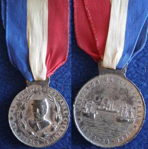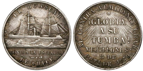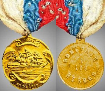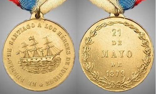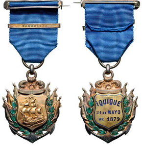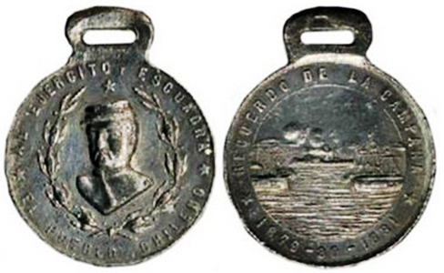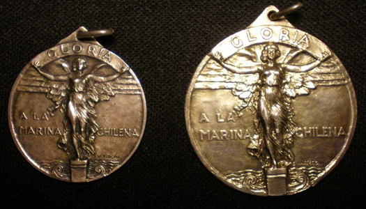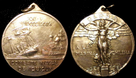 ![]() GOLD CROSS 1879-1880 and SILVER CROSS for the LIMA CAMPAIGN 1880- 1881 CROSSES for CAMPAIGN OF LIMA 1881 The Lima campaign started in November 1880, under the leadership of General Manuel Baquedano. By January 18, 1881, Lima and Callao had surrendered. The cross was created by a law of January 14, 1882. ![]() LIMA CAMPAIGN 1880-1881 GOLD CROSS The gold cross is a 44 mm white-enamel double pointed five-armed cross with finial ball tips. There are three green-enamel laurel leaves between each arm. Both the obverse and reverse of the gold cross depict a five-pointed, silver star encircled by a blue (obverse) or red (reverse) enamel band. The obverse is inscribed, CAMPANA DE LIMA 1881 and the reverse is inscribed, REPUBLICA DE CHILE. The 42 mm silver five-armed cross with finial balls and scaled details on the arms presents three silver laurel leaves in each quadrant. The center obverse depicts a five-pointed star surrounded by an enameled blue border with the inscription, CAMPANA DE LIMA 1881. The reverse features a similar star also surrounded by a blue-enamel border inscribed, REPUBLICA DE CHILE. Bars apply equally to both grades of the Lima Campaign Medal and are attached to the ribbon drape for the following engagements: (1) SAN FRANCISCO (Nov. 19–1880); (2) TARAPACA (Nov. 27–1880); (3) CHORILLOS (Jan. 13–1881); (4) MIRAFLORES (Jan. 15–1881) and (5) ANGAMOS (Oct. 8 -1879) The location name appears on the front of the bar and the corresponding date on the reverse. MEDAL of VALPARAISO 1879-81 The 49 x 30 mm silver medal was given by the city of Valparaiso to its various troops serving in the war with Peru and Bolivia during 1879–1881. It is a gold or silver medal framed in laurel leaves and having a condor with spread wings as the suspension device. Within the wreath is a blue-enameled band inscribed VALPARAISO A SUS VALIENTES, encircling the arms of that city, which consist of a background of rays surrounding an anchor surmounted by a crown formed of ships' sails and on the anchor, there is a shield bearing a two-funneled ship and with a star above. The reverse is inscribed within a laurel wreath, REGIMENTO VALPARAISO around a small five-pointed star, and outside of the wreath, CAMPANA CONTRA EL PERU Y BOLIVIA 1879-1881. Available bars are: MIRAFLORES and CHORILLOS. Variants exist with: (1) BATTALON DE CIVICO DE ARTILLERIA NAVEL and (2) VALPARAISO BATTALON reverses. ![]() CITY of VALPARAISO MEDAL to the BRAVE VAPARAISO REGIMENT 1879-81 MEDAL for MIRAFLORES 1881 In Quillota, during the 1860s there existed a Mobilized Civic Battalion Quillota. During the War of the Pacific, members of this battalion were authorized to carry arms and during August 1880, they were sent to support to the Chilean Army in the Battle of Miraflores. Among the ranks of the Quillotanos were the commanders: Jose Ramon Echeverria Castro, Figueroa Brito and Pragmacio Vial. The city awarded its men with a silver medal from the City of Quillota (one of the oldest cities of Chile) in recognition of their heroic actions. The 24 mm medal is of white metal, inscribed on the obverse, QUILLOTA A SUS HIJOS on four straight lines and on the reverse, within laurel branches surmounted by a small five-armed star, MIRAFLORES ENERO 15 1881. The correct ribbon is solid blue. ![]() MEDAL for MIRAFLORES 1881 MEDAL for ANGAMOS AKA the NAVAL CAMPAIGN MEDAL of 1879-80-81 The obverse of this 36 mm silvered-zinc medal bears the bust of General Manuel Baquedano, framed by laurel branches, encircled by the inscription, AL EJERCITO Y ESCUADRA above and EL PUEBLO CHILENO below. The medal is signed V. Prinz below the bust on the obverse. The reverse depicts a scene of naval combat, encircled by the inscription, RECUERDO DE LA CAMPANA 1879–80–1881. ![]() MEDAL for ANGAMOS AKA the NAVAL CAMPAIGN MEDAL of 1879-80-81 The Battle of Angamos was a naval encounter of the War of the Pacific fought between the navies of Chile and Peru at Punta Angamos, on October 8, 1879. The battle was the culminating point of a naval campaign that lasted about five months in which the Chilean Navy had the sole mission of eliminating its Peruvian counterpart. In the struggle, two armored frigates, led by Commodore Galvarino Riveros and Navy Captain Juan Jose Latorre battered and later captured the Peruvian monitor Huascar under Rear Admiral Miguel Grau Seminario. ![]() MEDAL for ANGAMOS (Detail) After the loss of the frigate Independencia at Punta Gruesa, Grau sought to challenge the outnumbered Chilean fleet by adopting a harassing strategy, focused on inflicting as much damage as possible while avoiding a full scale engagement. As Grau evolved along the Pacific coast, he was chased by Admiral John Williams Rebolledo, who had been ordered to catch Grau. His failure cost him his commission, and he was replaced by Riveros. ![]() ANGAMOS COMMEMORATIVE MEDAL With a different strategy, Riveros managed to encircle Grau at Punta Angamos, about 80 kilometers north of Antofagasta. Falling into a trap set by Riveros and Latorre, Grau was forced to engage the Chileans, after ordering the corvette Unión to escape to Peru. Latorre, aboard Almirante Cochrane, engaged first. Taking advantage of the powerful Armstrong-type batteries, Latorre shelled Huascar for almost two hours, and Grau was killed in the action. However, his flagship continued the fight while Riveros engaged her with the Blanco Encalada. After being battered for almost three hours, the Huascar, unable to sustain combat, was boarded and captured. The result was a complete success for the Chilean Navy, and secured its dominant naval position for the rest of the war. It allowed Chile to prepare for the invasion of the Tarapaca Department, carried out during early November. The Chilean Navy’s dominance of the Pacific coast contributed significantly to success in the following land campaigns across the Atacama Desert that ended with Lima's fall on January 1881. The Huascar was repaired and served und