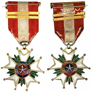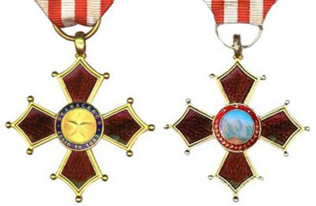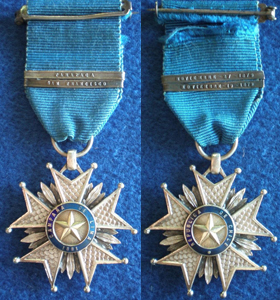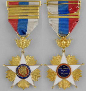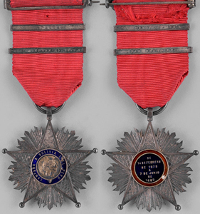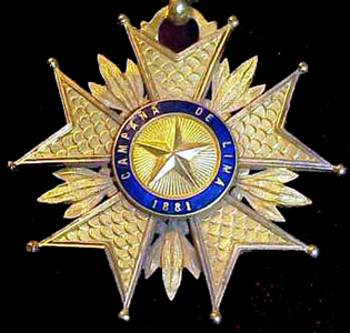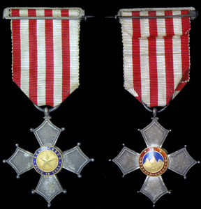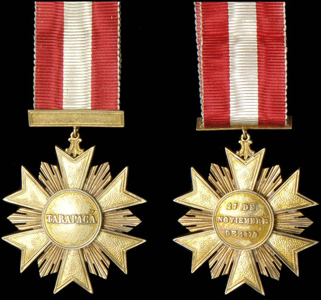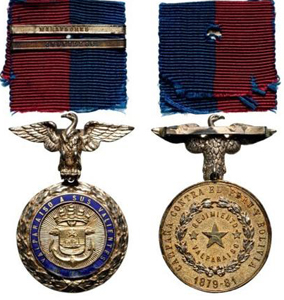 ![]() SENIOR OFFICER’S GOLD CROSS with FOUR BARS and SILVER CROSS 1879-1880 for JUNIOR OFFICERS and TROOPS For senior officers, it is a five-armed, 40 mm gold, white-enameled ball-tipped star with rays in the angles and suspended from a helmet and flags. In the center medallion is the head of Bellona, Goddess of War, on a red enamel field, around which is a blue-enamel band inscribed in letters of gold, CAMPANA A BOLIVIA I EL PERU. The reverse, encircled by a red enamel band is the inscription, DE 14 DE FEBRERO DE 1879 A 7 DE JUNIO DE 1880 on a blue- enamel field. The ribbon of the gold cross is red, blue and white. Bars were attached to the ribbon for the several engagements: (1) ARICA; (2) TACNA; (3) LOS ANGELES; (4) TARAPACA; (5) SAN FRANCISCO; (6) PISAGUA; (7) CHORILLOS; (8) ANGAMOS; (9) MIRQFLORES; (10) CHIPANA; (11) ANTOFAGASTA or (12) SORPRESA DE IQUIQUE. With the following dates placed on the reverse accordingly: (1) NOVIEMBRE 2, 1979; (2) NOVIEMBRE 19, 1879; (3) MAYO 26, 1880 or (4) JUNIO 7, 1880.The silver cross for junior officers and troops is similar to the gold cross, but without the helmet and flag suspension and with the arms of the cross decorated with scales in lieu of enamel. The ribbon is solid red. The same ribbon bars are applicable.