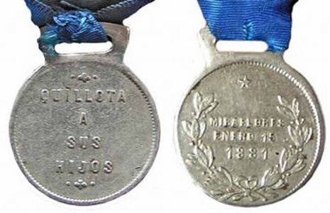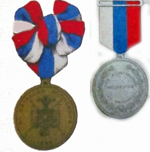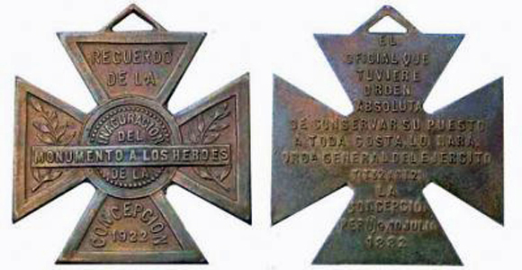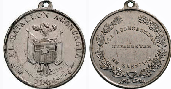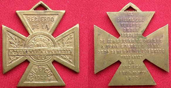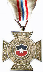 ![]() CROSS for the CAMPAIGN of the PERUVIAN HIGHLANDS 1879-84 and CROSS for the CAMPAIGN of the PERUVIAN HIGHLANDS 1879-1884 AKA the CAMPAIGN MEDAL for the SIERRA of PERU This is an award for those who fought in the War of the Pacific and against the Peruvian Guerilla resistance. The gilt medal is in the shape of a Cross Pattee. The center obverse features an enameled shield from the Chilean coat-of-arms. Below the shield are the dates 1879-1884. The circular inscription reads, CAMPANA DE LA SIERRA DE PERU 1869-1884. The reverse is blank. A variant has blue enamel on the arms and red enamel surrounding the enameled shield. It might possibly be a “do-it-yourself” enhancement. COMMEMORATIVE for the HEROES of the BATTLE OF CONCEPCION One of the most dramatic events of the Pacific War occurred on July 9-10, 1882 in the Peruvian town of La Concepcion. The entire garrison of the Chacabuco Regiment, composed of 77 officers and men, under command of Capitan Ignacio Carrera Pinto, resisted an attack by 2,000 Peruvian soldiers for two days, resulting in the death of the entire Chilean Regiment. The Chilean stand is considered one of the greatest deeds of the war. It was subsequently avenged by Chilean reinforcements, who sacked the town and killed all, but two of the remaining citizens. Col. Del Canto ordered that the hearts of the four officers: Captain Ignacio Carrera Pinto, Lieutenant Julio Montt, and Second Lieutenants Arturo Perez Canto and Luis Cruz Martinez, be extracted and sent in formalin to Santiago; the remains of the 77 Chileans were buried beside the church. Only in 1911, in one of Santiago's churches, were the hearts of the 4 officers permanently interred with a marker dedicated to the memory of all 77 killed in these two memorable days in Chilean history. ![]() GOLD COMMEMORATIVE for the HEROES of the BATTLE OF CONCEPCION ![]() BRONZE COMMEMORATIVE MEDALS for the HEROES of the BATTLE OF CONCEPCION Every July 9, all across Chile in ceremonies marking the final great Chilean military defeat, the battle is commemorated by the famous Juramento de la Bandera (Pledge to the Flag). It is recited throughout Chile in memory of this great and memorable battle, by the officers, warrant officers, non-commissioned officers, enlisted personnel, officer cadets and NCO cadets as part of a solemn yearly tradition ever since it was first recited on July 9, 1939. On the occasion of the 1922 dedication of a monument to the Heroes of the Battle of Concepcion, the Chilean government authorized a 40 mm silver and bronze commemorative medal in the form of a Cross Patte with a triangular shaped hanger in honor of the sacrifice made by their Regiment. The obverse is inscribed, RECUERDO DE LA on the upper arm, INAUGURATION DEL in the upper portion of the central rondel, MONUMENTO A LOS HEROES across the center, DE LA in the lower portion of the rondel and CONCEPCION 1922 on the lower arm. The reverse is inscribed with an excerpt from Title 31, Article 21 of the General Orders of the Chilean Army, THE OFFICER WHO HAS ABSOLUTE ORDER TO KEEP HIS POSITION AT ALL COSTS, WILL DO IT. The medal has been observed suspended from the same ribbon as the Cross for the Campaign of the Peruvian Highlands. Since the medal had an "unofficial" status, images of it being worn by active military as well as veterans exist. Of small note, the badge is nearly identical to the Peruvian medal for the Battle of San Pablo on July 13, 1882, except for the inscriptions. ![]() MEDAL for BATALLON of ACONCAGUA 1884 BATTLE of PUNYAN HILL The Chilean army decided to launch an attack against the Confederation at Punyan Hill. The Aconcagua Battalion was dispatched to clear the hill of enemy forces and succeeded. Aconcagua, situated in the Andes, with a summit elevation of 6,960.8 meters (22,837 ft), is the highest peak in both the Southern and Western Hemispheres. MEDAL for BATALLON of ACONCAGUA 1884 This is a 24 mm, silver or bronze medal. The obverse bears a shield with the arms of Chile, surmounted by three plumes and superimposed on two crossed flags. The curved inscription around the border reads, AL BATALLON ACONCAGUA 1884. The reverse, within knotted laurel branches is inscribed, LOS ACONCAGUINOS RESIDENTES EN SANTIAGO. The ribbon is solid red, although the medal has been observed on a red-blue-white ribbon in the Chilean publication, Represntantes Provincia Aconcagua Guerra Pacifico 1879. ![]() IMAGES from REPRESNTANTES PROVINCIA ACONCAGUA GUERRA PACIFICO 1879