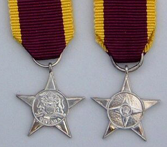 The obverse of the silver five-pointed cupro-nickel star has a circular central medallion bearing the arms of the Co-operative Republic of Guyana) and is inscribed, GUYANA at the base. The reverse bears a four- pointed star in the central rondel with a cacique crown in the center of the four-pointed star. The Star was instituted in 1970 following Guyana becoming a republic and is the highest award presented for military service to officers of the Guyana Defense Force, Guyana People's Militia and the Guyana National Service for exceptional service above and beyond the call of duty or for gallantry in action.