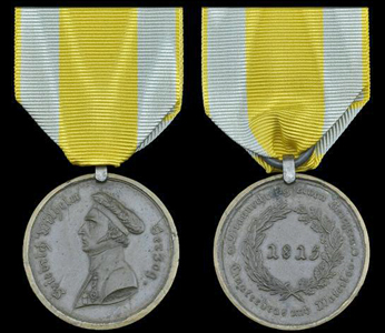 ![]() Benedetto Pistrucci's Large Waterloo Medal In 1990, the Royal Mint struck a reduced-size collector's version in bronze for the 175th anniversary of the battle. It struck one in silver, also for collectors, for the 200th anniversary in 2015, with Pistrucci's inscriptions, eliminated from the original, from the wax models restored. In 2014, as part of the preparations for the battle's bicentenary, the Worcestershire Medal Service (Queen Elizabeth II's official medalist), on behalf of the London Mint (a private firm) prepared full-size versions in silver. They were presented to the ambassadors of Austria, Russia, and Germany (as successor to Prussia), with the Queen to receive one later, and were also made available for sale to the public at 3,900 BPS each. Other Waterloo Medals Waterloo Medals were also issued by: (1) the Duchy of Brunswick; (2) the Hanoverian Army; (3) the Duchy of Nassau; (4) Prussia; and (5) Holland. Duchy of Brunswick The 34mm round, bronze Duchy of Brunswick medal was made from captured French cannons. Medals for officers were gilded. The obverse depicts a left-facing profile of the fallen Duke of Brunswick, Frederick William. Around the edge is the inscription, in German Script, FRIEDRICH WILHELM HERZOG. The reverse of the medal bears the date, 1815, in the center, surrounded by a wreath of oak and laurels. Approximately 6,000 Brunswick troops fought in the war. ![]() Duchy of Brunswick Waterloo Medal The obverse of the Hanoverian Waterloo Medal, like the British Waterloo Medal, has a profile and laureate head of the Prince Regent with the legend GEORG. PRINZ. REGENT, 1815, inscribed around it. The was issued to all members of the Hanoverian army who fought in the battles of Quatre Bras and Waterloo June 16–18, 1815. The reverse has two branches of laurel and a breastplate, with two spears and two colors crossed on either side. Below this is the date, WATERLOO JUN. XVIII, and above, in Roman letters, HANNOVER SCHER TAPFERKEIT. The soldier's name, regiment, etc is indicated around the rim. The Hanoverian troops, excluding those of the King's German Legion, present on the 16th, 17th, and 18th of June at Battle of Quatre Bras and Waterloo, under the command of General Charles Alten, amounted to approximately 11,000 men. ![]() Hanoverian Waterloo Medal The 28.9mm, silver Waterloo Medal of the Duchy of Nassau was established by Frederick Augustus, Duke of Nassau on December 23, 1815. It features his effigy on the obverse surrounded by the inscription, FREDRICH AUGUST HERZOG ZU NASSAU. The reverse features winged victory placing a wreath upon a figure's head, surrounded by the inscription, DEN NASSAUISCHEN STREITERN BLY WATERLOO and the date DEN 18 JUNI 1815 in the exergue. Nassau fielded approximately 3,000 troops. ![]() Duchy of Nassau Waterloo Medal Combatants received the circular bronze medal, reputedly made from the captured French cannon brass. Non- combatants received the oval version. The obverse features a cross pattee with a wreath and the date 1815 at its center. The reverse features four clasped arms. The obverse of the medal features a cross pattee with rays between the arms, the date 1815 centrally within a laurel wreath. The reverse features the crowned cipher of Friedrich Wilhelm III above the inscription PREUBENS TAPFERN KRIEGERN (Prussia’s brave warriors) circumscribed GOTT WAR MIT UNS, IHN SEY DIE EHRE (God was with us to Him the glory) On the edging is inscribed AUSEROBERTEM GESCHUTZ (from captured cannon). The medal exists with the obverse cross featuring both squared and rounded edges and with the dates: 1813, 1814, 1813/1814 and 1815. The Prussians fielded an approximately a 50,000 man army under Gebhard Leberecht von Blucher, Furst von Wahlstatt.