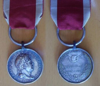 Waterloo Medal (1815) It was announced in the London Gazette on April 23, 1816 that the Prince Regent conferred the Waterloo Medal upon every officer, non-commissioned officer, and soldier of the British Army (including members of the King's German Legion), who took part in one or more of the following battles: (1) Battle of Ligny (June 16, 1815); (2) Battle of Quatre Bras (June 16, 1815); and (3) the Battle of Waterloo (June 18, 1815). The 37mm, silver medal was issued in 1816–1817. The obverse bears the effigy of the Prince Regent with the inscription, GEORGE P. REGENT, while the reverse depicts the seated figure of Victory with the words WELLINGTON above and WATERLOO below and the date JUNE 18 1815 in the exergue. A total of 37,500 were issued.