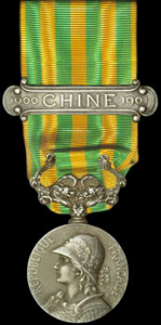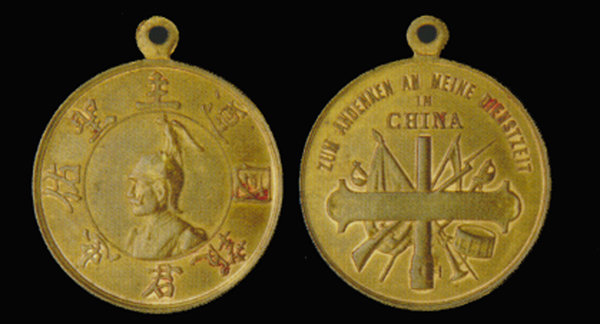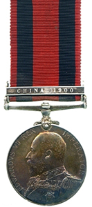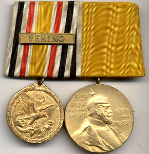 Medal GroupsAustro-Hungary The obverse of the circular silvered zinc alloy medal (sizes vary from 36 to 37.5mm) depicts the face with the laurel-crowned head of Emperor Franz Joseph I facing right circumscribed FRANZ JOSEPH I. KAISER V. OSTERREICH. KONIG V. BOHMEN ETC. APOST. KONIG V.UNGARN. The reverse is dated 2 DECEMBER 1873 (2 DEZEMBER 1873 after 1900) within a wreath of oak and laurel. The medal was instituted in 1873 and served to recognize participation in campaigns from 1848 to 1913 conducted by the Austro-Hungarian military. This is the only medal not specifically issued for the Boxer Rebellion. It was used to commemorate 16 separate campaigns, which include the 1900 and 1901 engagements in the Boxer Rebellion. France Established April 15, 1902, the 30mm silver obverse depicts the head of the Republic in tropical helmet and the inscription, REPUBLIQUE FRANCAISE. The reverse features crossed canons, anchor and flag in front of a Chinese pagoda with the inscription, CHINE above and 1900 and 1901 to the left and right. The medal was also awarded without the bar. Germany The 32mm China Campaign Medal was instituted by Kaiser Wilhelm II in May 1901 and was awarded to all German combatants and non-combatants who served in the Boxer Rebellion between May 30, 1900 and June 29, 1901. The obverse depicts a German eagle victorious over the Imperial Chinese dragon. The reverse of the medal was again edged with laurel leaves and showed a crowned "W II" monogram and the inscription, DEN SIEGREICHEN STREITERN- 1900 CHINA 1901 (To the Victorious Fighters). The non-combatants' version of the China Campaign Medal was identical except that it was made from polished steel and has the inscription, VERDIENST UM DIE EXPEDITION NACH CHINA (Served in the Expedition to China) on the reverse. The non-combatant’s version was also awarded to merchant seaman, who ferried supplies to China. Imperial Russia The light (non-combatants) and dark (combatants) bronze 28mm Medal for the Chinese Campaign 1900-1901features the crowned Nicholas II cipher on the obverse. The reverse has the dates 1900-1901above an anchor crossed by a rifle with fixed bayonet and saber on the reverse. The Cyrillic surround inscription loosely translates as FOR SERVICE IN CHINA. Variances exist particularly noted are the size of the anchors on the medal's reverse. Italy The 32mm bronze Commemorative Medal for the Campaign in China was established on June 23, 1901. The obverse depicts the bust of Victor Emmanuel III surrounded by the inscription, VITTORIO EMMANUELE III RE D’ITALY. There are two alternate reverses (1) CINA 1900-1901 on two lines surrounded by a laurel wreath and (2) a single line inscription CINA surrounded by a laurel wreath.There were a total of 2,325 medals awarded.The medal is encountered with and without a clasp. The clasp denotes participation during actual hostiles. The medal was also awarded for China service after cessation of hostilities without the clasp. Japan The obverse of the circular copper-colored bronze medal with decorated swivel suspension depicts a chrysanthemum crest above the four characters WAR MEDAL, all within the outstretched wings of a Phoenix. The reverse is inscribed with characters meaning the GREAT JAPANESE EMPIRE / MEIJI 33RD YEAR. The medal was created on 21 March 1901 for the members of the 5th Division of the Imperial Japanese Army and of the Japanese Imperial Navy who were part of the eight-nation alliance forces who lifted the two and a half month siege of the Foreign Legations in Peking (Beijing) during the Boxer’ Rebellion. United Kingdom The China War Medal 1900 was approved in 1901 for issue to land and sea forces. It was issued in silver to combatants and in bronze to native bearers, drivers and servants. It was also issued without a clasp. The medal used the same reverse as the two previous China War medals, a trophy-of-arms, with the obverse consisting of the bust of Queen Victoria. The medal was awarded to 555 naval personnel of the Australian Navy without a clasp, 256 men with the New South Wales Contingent, 197 with the Victorian Army and 102 naval personnel of the Gunboat Protector. No medal was issued with more than two of the available bars The obverse of the Transport Medal bears the head of King Edward VII facing left with the legend EDWARD VII REX ET IMPERATOR. The reverse depicts a map of the world with a transport vessel and the inscription OB PATRIAM MILITIBUS PER MARE TRANSVECTIS ADJUTAM. Two clasps were awarded and a recipient could receive one or two clasps. The clasps were SOUTH AFRICA 1899-1902 and CHINA 1900. This medal was awarded to ship masters, first, second, third and chief Officers, first, second, third and chief Engineers as well as Pursers and Surgeons. The medal was also presented to those who served in 11 hospital ships employed during the two conflicts. A total of 1,822 medals were issued, 322 with CHINA 1900 only and 178 with dual clasps. USN/MC China Relief Expedition Medal This medal was issued to officers and enlisted men who served on shore in China with the Peking Relief Expedition between May 24, 1900 and May 27, 1901, or who were attached to one of the following vessels: Brooklyn Buffalo Iris Monocacy Nashville New Orleans Newark Solace Wheeling Yorktown Zafiro The ribbon of this medal originally bore the yellow and black motif. The colors were changed in 1915 to yellow and blue to correspond with those of the U.S. Army medal issued for similar service. The first 400 medals struck bear the date "1901." The die in use became damaged and replaced with a re-engraved die. This one, however, had the date "1900" which appears on all subsequent copies. The obverse depicts the main gate to the walled city of Peking and the imperial dragon in profile, surrounded by the words, CHINA RELIEF EXPEDITION in the upper half and the date at the base. The reverse depicts an eagle with its wings displayed alight upon an anchor with draped chain, over the w