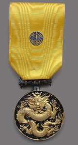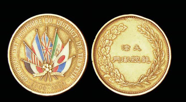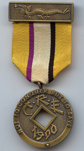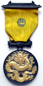 The Order of the Double Dragon was instituted by Emperor Kuangsi on the 7th of February, 1882, as an award for meritorious services to the Throne. Initially it was awarded exclusively to foreigners, but its scope was later extended to include Chinese subjects from 1908. This particular Order was awarded to Brigadier General F W B Gray CMG DSO (1867-1931), c.1901, for services rendered as Captain with the 3rd Brigade, 4th Punjab Infantry - part of the China Field Force during the Boxer Rebellion of 1900. He is noted as having been present during the action at Tai Tao Ying. Certificate Medal of the Leader of the K’an Trigram (Group) of Righteous Harmony Society Medal. On the front side of the silver medal are four Chinese characters “I HO SHEN CH’UAN”, with one of the Eight Trigrams “K’AN” engraved in the middle. On the back side is the slogan of the society, “SUPPORT THE QING, DESTROY THE FOREIGN”. Based on the organization of Righteous Harmony Society and the material of the medal, the item is the certificate medal of the leader of the K’an Trigram (Group) of Righteous Harmony Society. The medal is extremely rare. ![]() Harmony Society Boxer Medal ![]() Merit Medal for Native Troops ![]() Tientsin Commemorative Gold Medal 1900-1902