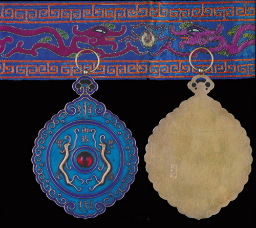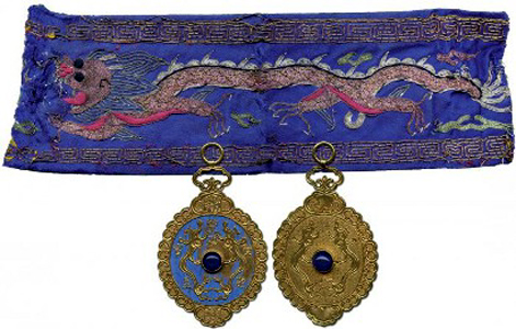 The obverse shows an egret feathered field in blue with central cabochon sapphire on both sides and measures 39mm x 67mm including ring suspension. It also weighs 36.1g, with segment of beautiful original neck ribbon and modern lanyard.