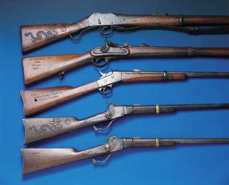 VII. Weapons ![]() German Mauser “Broomhandle” 1896 ![]() Imperial Russia Nagant M 1895 Revolver ![]() Italian Bodeo M89 Pistol ![]() Japan Type-26 Revolver (Image courtesy of Professor Teri Bryant of Nambu World: http://members.shaw.ca/tju/jhg.htm) Note: This specific model was manufactured after the Boxer Rebellion, but the pistol was being made and in use by Japanese forces during the period 1900-1901) ![]() United Kingdom Webley Break-Top Revolver ![]() US Colt 1900 .38 ACP ![]() A.50 Remington Rolling Block Carbines Two stocks are carved with a dragon chasing a flaming pearl, another is inscribed: M FITZPATRICK CPO VICT NAVEL CONT, TIEN TSAN, CHINA 1900 AND 1901.
