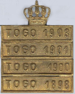 German Togoland Following the arrival of German missionaries in 1847, German trading companies founded all four German colonies in Africa in 1884. Unfortunately, the trading companies proved unable to manage a colony. Beginning in 1885, administration of the colony was ceded to the Imperial German government. The German desire to expand their holdings led to ongoing and periodic conflicts with the native inhabitants of their holdings. ![]() German Togoland Flag Togoland was the only German colony not to have a Schutztruppe (German Officers and NCO’s commanding native troops). Instead Togoland had a para-military police force. The police force was divided seggregated based on tribal background. Conflicts in Togoland consisted of more than 45 small engagements against rebellious tribes. The most ardent opponents were the Dagombe who resented the German control over traditional trade routes. The Dagombe rebelled against the Germans along with their ally, the Konkomba, who resented loss of the tribal lands. In September 1896, Lt. Valentine von Massow and a force of ninety-one police marched into the area to quell the revolt. They were attacked at Adibo by 6,000-7,000 Dagombe and Konkomba warriors. The use of machine-guns and discipline saved the day for the Germans. Some 500 natives were killed and their forces scattered. Shortly after the Battle of Adibo, Massow and his forces captured the Dagombe capital, Yenbli, and raised it. The rebellion soon ended. ![]() The bars for the Imperial German Colonial Medal recognizes following periods of conflict in Togoland: 1894/95, 1895, 1896, 1896/97, 1897, 1897/98, 1898, 1899, 1898/99, 1900, 1900/01, 1901, 1902, and 1903. ![]() As soon as war broke out in the summer of 1914, British forces from the Gold Coast Dependency and French forces from Dahomey launched an immediate attack on Togoland. The efficiency of their invasion and the limited strength of the resident German forces combined made for a speedy capitulation. ![]() Unofficial Clasp for Togo Service