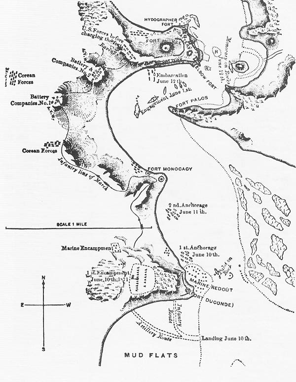 The Korean Expedition of 1871 ![]() The Korean Expedition of 1871 In 1866, the General Sherman, an armed merchant marine side-wheel steamer, sailed into Korean waters and was never heard from again. Its disappearance was rooted in mystery and speculation. In reality, as early as 1868, Korean officials acknowledged that the General Sherman had been sunk and the crew killed for ignoring the Korean ban on foreigners and in effect violating Korean sovereignty. One of several explanations had the ship destroyed on the Tae-dong River. The Korean Kingdom’s adversity to foreigners would set the stage for the US Korean Expedition to follow in another five years. ![]() The Earliest Known Flag of the Kingdom of Korea An American naval force of 650 men (500+ sailors and 100 Marines) and five war ships: USS Colorado, USS Alaska, USS Palos, USS Monocacy and USS Benica under the command of Rear Admiral John Rodgers had shown up in support of a futile attempt by US Ambassador to China, Frederick F. Low, who was onboard the USS Colorado, to negotiate a trade treaty with Korea. The U.S. naval force would ultimately unleash a punishing attack on the natives for depredations on Americans, particularly for murdering the crew of the General Sherman and burning the ship, and later for firing on American boats taking soundings on the Salee River. ![]() Ganghwa (Kanghwa) Island ![]() Gwangeong Fortress (the Citadel) Anhaeru Gate Following a heavy American bombardment of the Citadel, the American forces led by Lt. Hugh McKee, one of three Americans killed-in-action, charged the fortress. When the battle was over, the Americans had captured the battle flag of General Eo Uh Je-yeon, who was also killed during the action, at a cost of 248 Koreans and three Americans killed in action. A fourth American fatality was subsequently attributed to disease. Following the action (June 10-12, 1871), the US Asiatic Squadron remained at anchor off Jakyak Island until July 3, 1871 when it eventually returned to Chinese waters. ![]() USS Monocacy ![]() The Captured Battle Flag, Called Sujagi, of General Eo Uh Je-yeon Onboard the USS Colorado. From April to May 1882, the United States and Korea eventually negotiated and approved a 14 article Treaty of Amity and Commerce. The treaty established mutual friendship and mutual assistance in case of attack. The treaty also addressed extraterritorial rights for American citizens in Korea and most favored nation trade status. The treaty remained in effect until the eventual annexation of Korea by Japan in 1910. Marines would return in 1888 and again in 1904-5 to protect American interests during periods of unrest. Nine sailors and six Marines were awarded the Medal of Honor, the first for actions in a foreign conflict. At the time of the expedition, only enlisted men were eligible to receive the medal. U.S. Navy Recipients ANDREWS, JOHN, Ordinary Seaman, U.S. Navy, USS Benicia FRANKLIN, FREDERICK, Quartermaster, U.S. Navy, USS Colorado GRACE, PATRICK H., Chief Quartermaster, U.S. Navy, USS Benicia HAYDEN, CYRUS, Carpenter, U.S. Navy, USS Colorado LUKES, WILLIAM F., Landsman, U.S. Navy Mc KENZlE, ALEXANDER, Boatswain's Mate, U.S. Navy, USS Colorado MERTON, JAMES F., Landsman, U.S. Navy ROGERS, SAMUEL F., Quartermaster, U.S. Navy, USS Colorado TROY, WILLIAM, Ordinary Seaman, U.S. Navy, USS Colorado ![]() US Navy and Marine Corps Medal of Honor Type 1 With Fouled Anchor BROWN, CHARLES, Corporal, U.S. Marine Corps, USS Colorado COLEMAN, JOHN, Private, U.S. Marine Corps, USS Colorado DOUGHERTY, JAMES*, Private, U.S. Marine Corps, USS Benicia McNAMARA, MICHAEL, Private, U.S. Marine Corps, USS Benicia OWENS, MICHAEL, Private, U.S. Marine Corps, USS Colorado PURVIS, HUGH, Private, U.S. Marine Corps, USS Alaska ![]() USN Good Conduct Badge – the Only Other US Medal at the Time References http://www.homeofheroes.com/wallofhonor/korea1871/1_preface.html www.shinmiyangyo.org